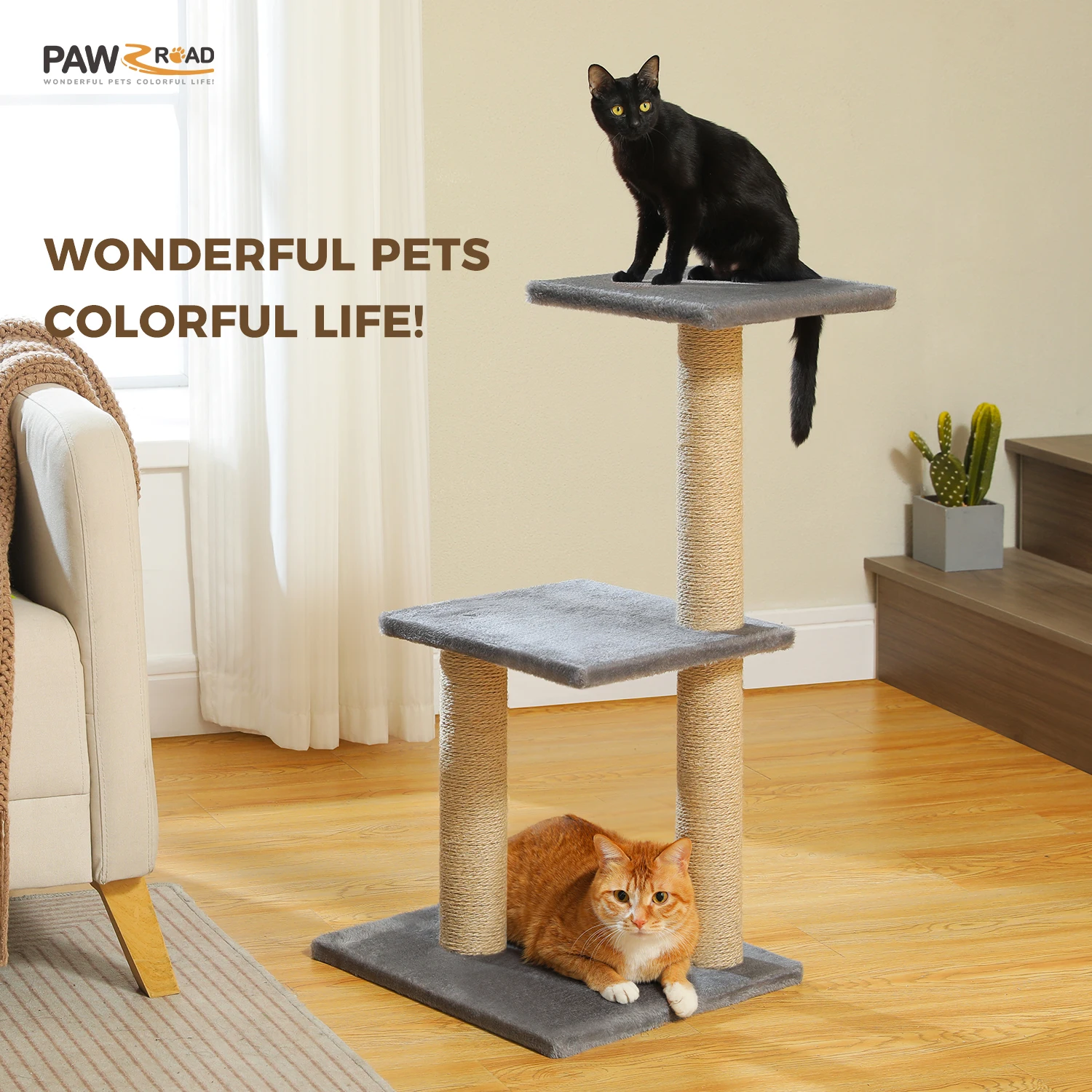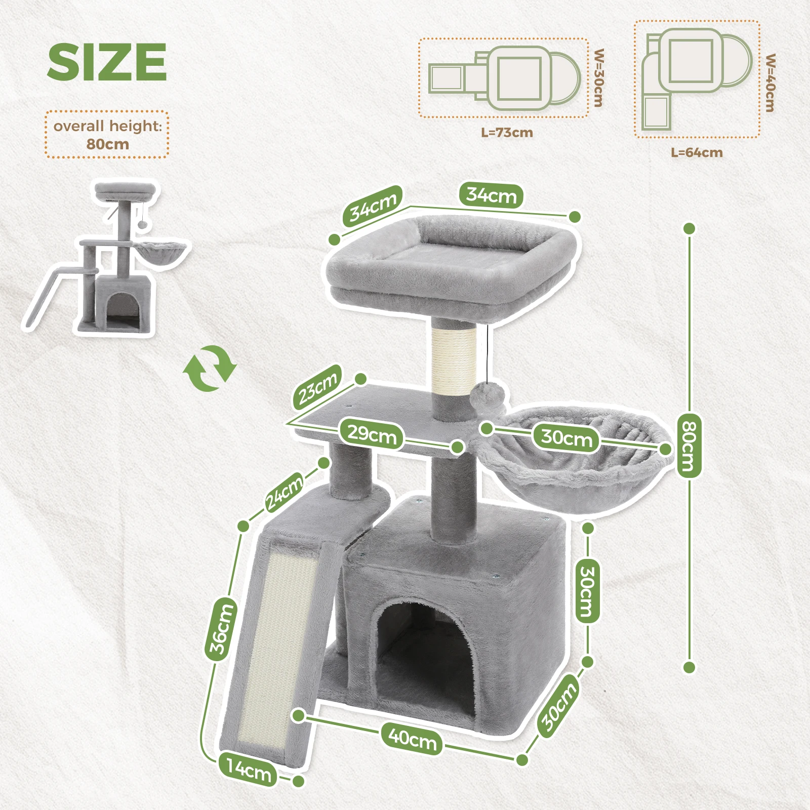 Give your cat a complete play and rest space with the Cat Tower for Indoor Cats. Designed in two versatile styles, it features multiple levels, sisal scratching posts, a spacious hammock, and a removable top perch for flexible lounging and observation.